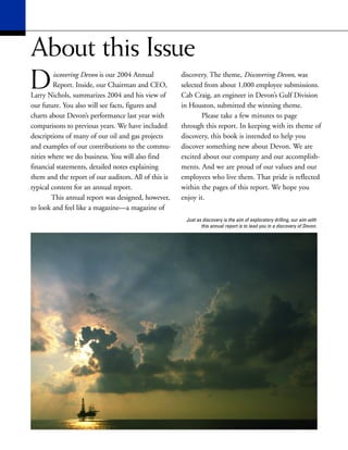 This document appears to be the 2004 annual report for Devon Energy Corporation. It provides key financial and operating metrics for 2004, highlighting record performance including net earnings of $2.2 billion, total revenues of $9.2 billion (up 25% from 2003), and cash flow from operations of $4.8 billion (up 28% from 2003). It also notes a 10% increase in oil, gas, and natural gas liquids production to a record 251 million equivalent barrels. The report provides an overview of the company's operations and performance in 3 sentences or less.