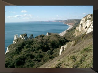The document discusses the Devonian period and various Devonian fossil sites. It begins by explaining the etymology of the term "Devonian" from Devon, England where the rocks were first studied. It then describes three specific Devonian fossil sites - a fossil gorge in Iowa discovered after flooding where crinoids, brachiopods and coral can be found, fossil beds in Indiana and Kentucky originally part of the Ohio River featuring rugosan corals, brachiopods and trilobites, and formations in Oklahoma containing over 30 trilobite species.