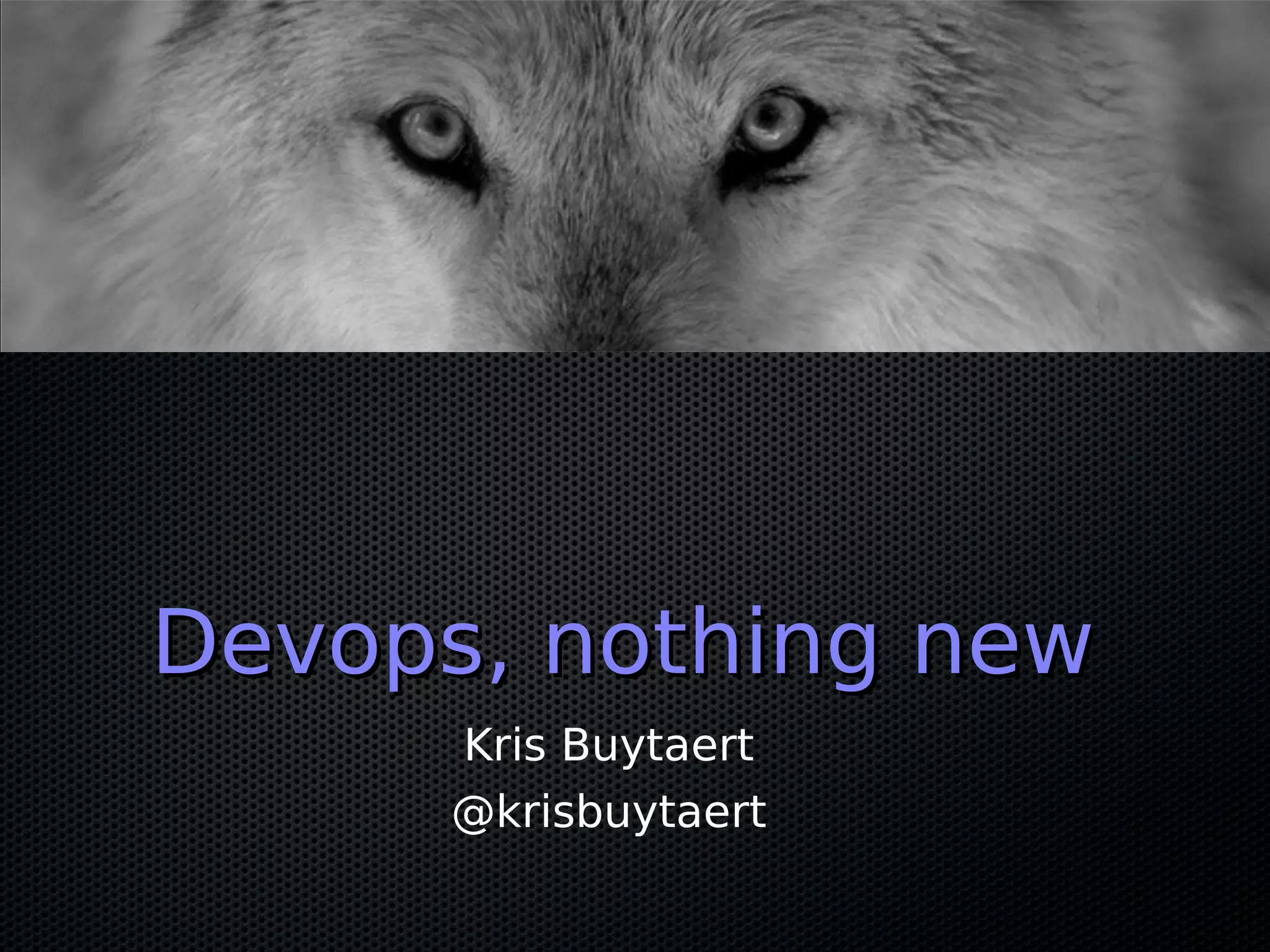 Devops is not a new concept, but rather a growing movement that aims to break down barriers between development and operations teams. It promotes automating processes, measuring outcomes, and sharing knowledge across teams. The goals are to speed up delivery of features, improve reliability and safety, and make customers, developers and operations staff happier. Central to devops is adopting a culture of collaboration between teams through practices like continuous integration, infrastructure automation, and enabling fast and reliable software deployments.