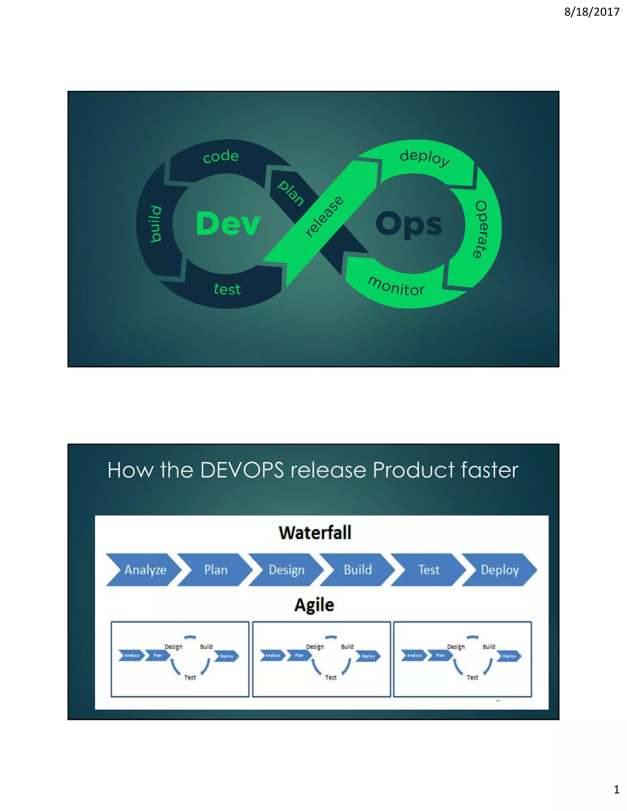 DevOps is the practice of operations and development engineers participating together in the entire service lifecycle, from design through development and into production support. It aims to deliver software incrementally from the start of a project through continuous delivery in short two week cycles called iterations. Adopting DevOps, even for large mainframe shops, can lead to significant gains like reducing critical defects by 80% and improving maintenance efficiency by 20% in just 18 months. DevOps establishes a continuous feedback loop that speeds up development and deployment while maintaining quality, moving away from traditional waterfall methodologies.