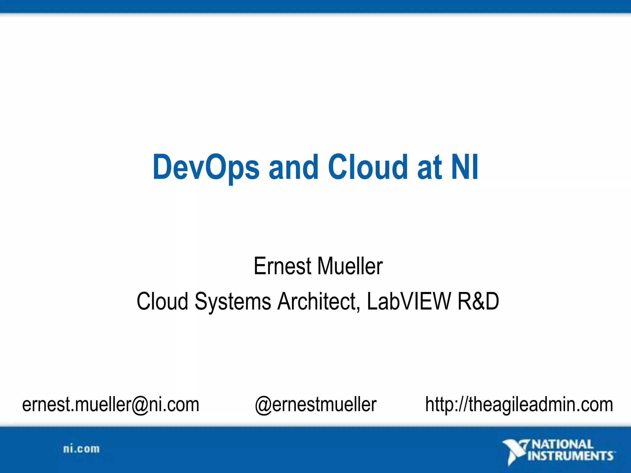 National Instruments built a DevOps team to rapidly deliver new cloud-based software products using cloud hosting platforms and model-driven automation. With this approach, the small DevOps team has quickly delivered multiple major products to market with low costs. The team uses agile processes, cloud infrastructure from Amazon Web Services and Microsoft Azure, and a custom system called PIE for infrastructure automation. This has allowed National Instruments to innovate faster while maintaining reliability.