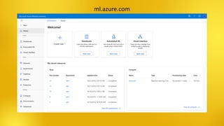The document discusses the integration of DevOps practices with machine learning, emphasizing the continuous delivery of value through a collaborative approach among developers, data scientists, and operations. It highlights Azure Machine Learning as a fully-managed service for building and deploying predictive analytics solutions, utilizing various tools and frameworks for model training and deployment. The document also outlines the steps involved in creating machine learning pipelines, including data preparation, model management, and deployment processes within Azure environments.