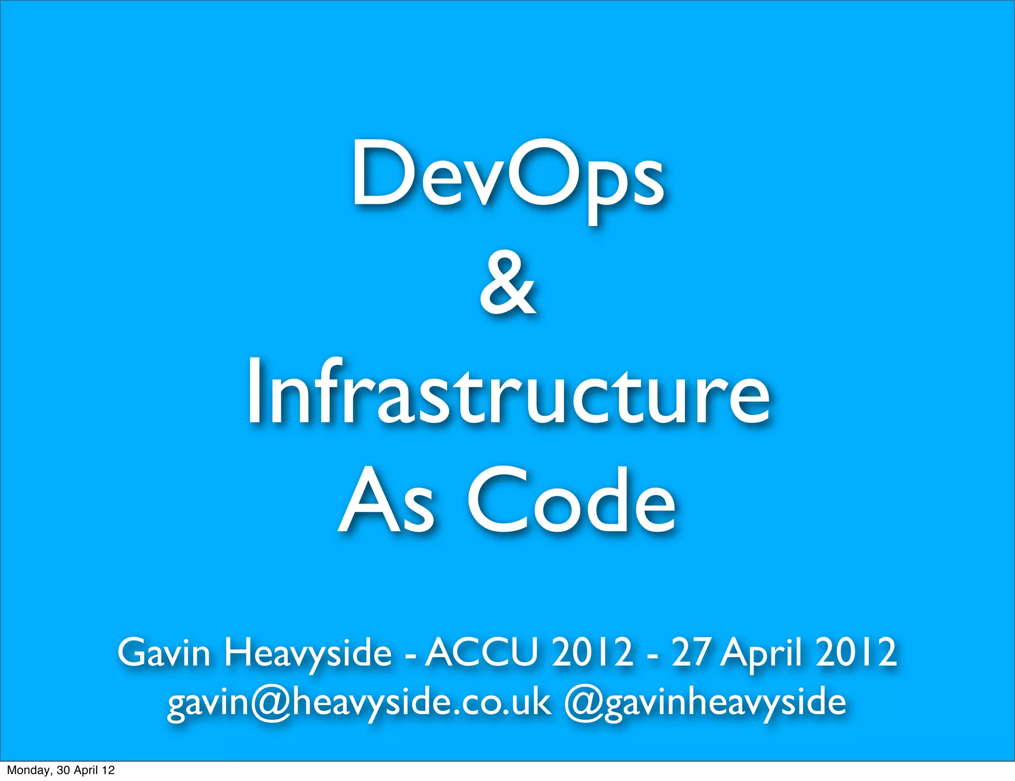The document discusses DevOps and infrastructure as code. It introduces key concepts of DevOps like using configuration management tools like Chef and Puppet to define infrastructure as code. This allows infrastructure to be treated as code that can be versioned, tested, and deployed. The document also discusses how tools like Chef, Vagrant, and monitoring tools can help teams work collaboratively and deploy applications using automation for continuous delivery.