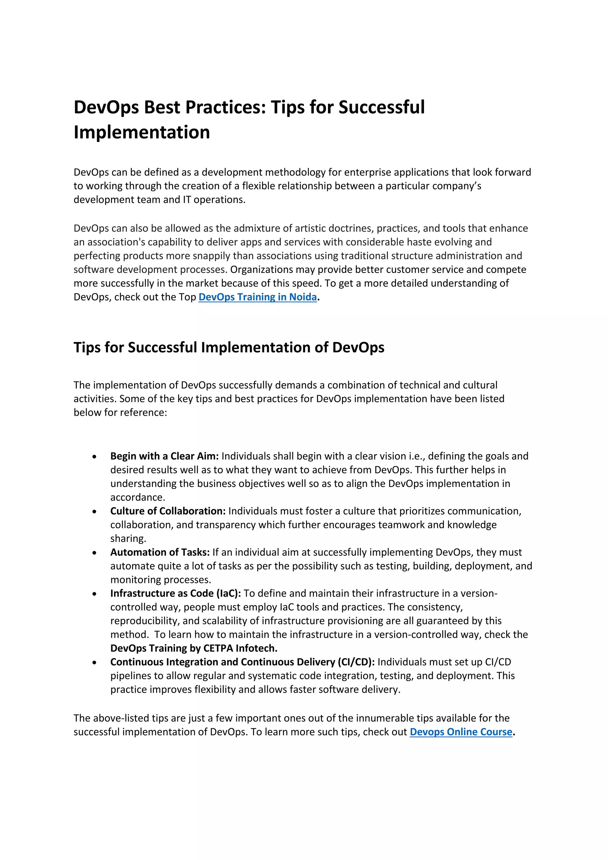 The document outlines best practices for the successful implementation of DevOps, emphasizing the importance of clear goals, collaboration, task automation, and infrastructure as code. It highlights strategies such as continuous integration and continuous delivery to enhance app delivery speed and improve customer service. Ultimately, it suggests that DevOps is an ongoing effort requiring continual adaptation to meet organizational needs.