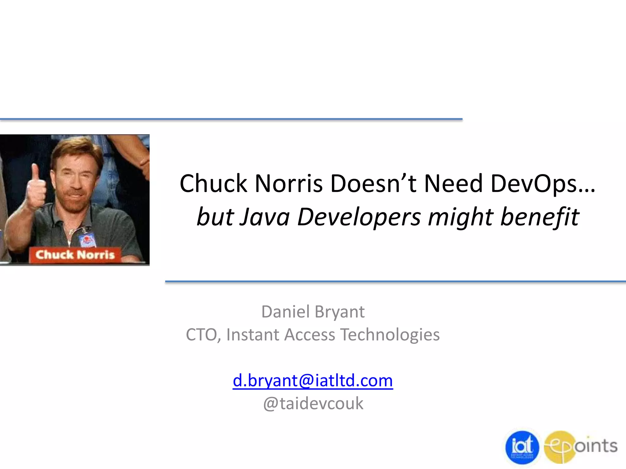 The document discusses the concept of DevOps, emphasizing its role in enhancing communication and collaboration between software developers and IT operations. It highlights the importance of cultural change, continuous integration, and automation in software development while using humorous references to Chuck Norris to illustrate the challenges faced by teams. The key takeaways include the need for organized team structures, effective QA automation, and designing for failure in cloud environments.