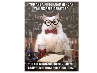 The document discusses the integration of DevOps practices into data science, focusing on deploying analytics into production and the responsibilities of data scientists and data engineers. It outlines the importance of feedback loops, testing, and monitoring in the deployment process, as well as the challenges faced in ensuring analytics reliability. The presentation also introduces Hydrosphere's tools, like Mist and Swirl, for managing machine learning models and analytics services efficiently.