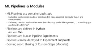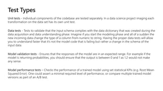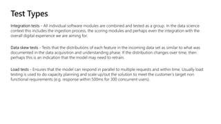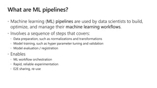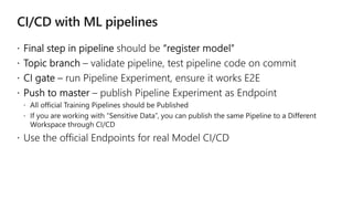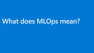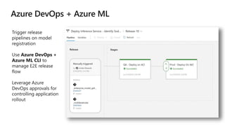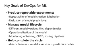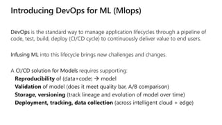 This document discusses applying DevOps practices and principles to machine learning model development and deployment. It outlines how continuous integration (CI), continuous delivery (CD), and continuous monitoring can be used to safely deliver ML features to customers. The benefits of this approach include continuous value delivery, end-to-end ownership by data science teams, consistent processes, quality/cadence improvements, and regulatory compliance. Key aspects covered are experiment tracking, model versioning, packaging and deployment, and monitoring models in production.