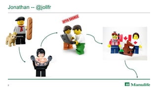 The document outlines Manulife's transition to a technology-driven company, emphasizing the integration of DevOps practices and modern application development methodologies. It highlights the company's strategic platform choices, including Kubernetes and Cloud Foundry, to support both legacy and new applications. Additionally, it discusses the importance of automated practices, security measures, and the company's commitment to open source contributions and community support.