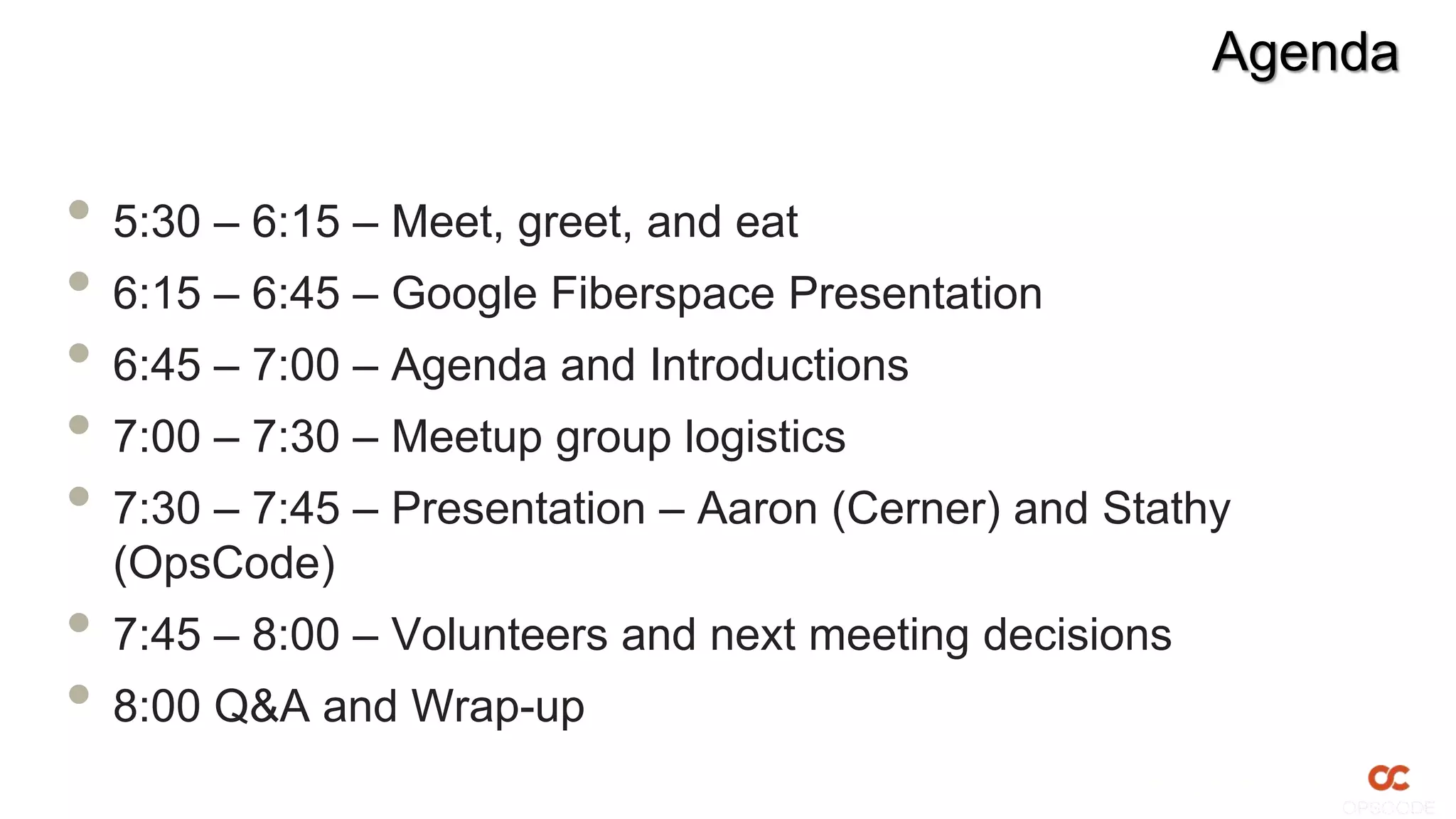 This document contains the agenda for the Kansas City DevOps Meetup on December 5, 2012. The agenda includes presentations on Google Fiberspace and DevOps logistics by Aaron from Cerner and Stathy from OpsCode. It also discusses deciding on topics and volunteers for future meetups, with suggestions like infrastructure as code, continuous deployment, and experience sharing.