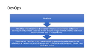 The document discusses DevOps as an agile relationship between development and IT operations, emphasizing improved communication and collaboration. It outlines tools and services available on Google Cloud Platform (GCP) for continuous integration, delivery, and deployment, comparing them to AWS offerings, and highlighting differences in API management. GCP's support for DevOps is presented as similar to AWS, with specific tools like Cloud Build, Container Registry, and Cloud Endpoints facilitating efficient workflows.