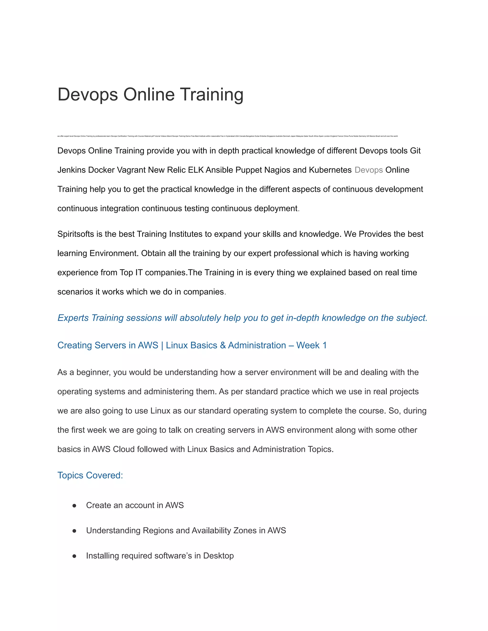 The document outlines an extensive DevOps online training program offered by Spiritsofts, covering various tools and methodologies for continuous development, integration, and deployment. The course spans over eight weeks and includes practical knowledge on AWS services, Docker, Kubernetes, CI/CD practices, and Infrastructure as Code using Terraform. It aims to equip participants with in-depth skills and knowledge essential for effective DevOps practices in real-world scenarios.