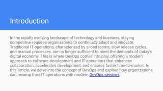 This document discusses the importance of modern DevOps services in revamping traditional IT operations to enhance collaboration, accelerate development, and improve time-to-market. It highlights key principles like automation, continuous integration, and continuous delivery, emphasizing their benefits such as faster delivery times and improved software quality. The article also outlines steps for implementation, including cultural transformation and investment in automation tools.