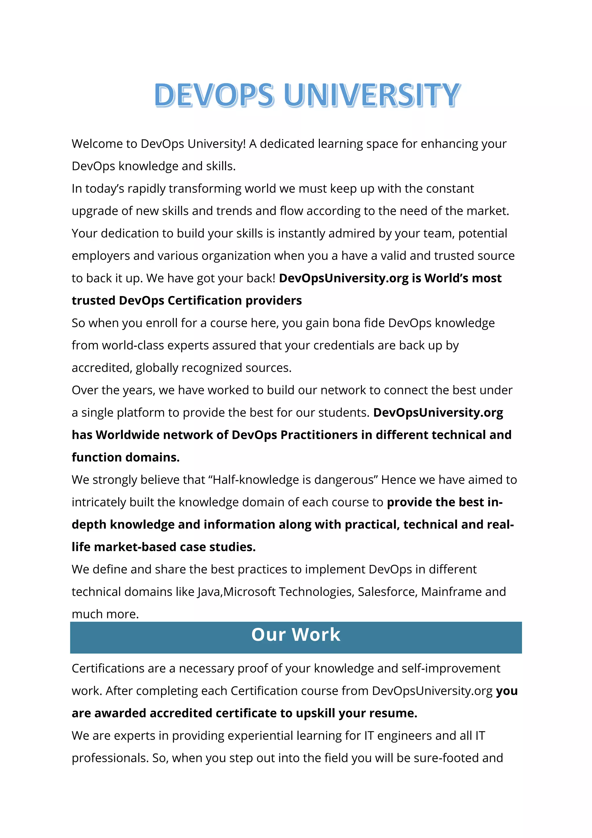 DevOps University provides a dedicated platform for enhancing DevOps skills through accredited certification programs taught by industry experts. Their services include career counseling, mentoring, and experiential learning for IT professionals, helping both large and small enterprises in implementing DevOps solutions. The growing demand for certified DevOps professionals underscores the importance of these credentials in securing competitive positions in the IT job market.
