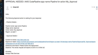 This document discusses DevOps practices using Amazon Web Services. It describes how AWS services like CodeCommit, CodeDeploy, and CodePipeline can help implement a continuous delivery pipeline for developing and deploying microservices architectures. These services provide automated testing, deployment to multiple environments including production, and integration with third-party tools to streamline the release process for development teams. The document provides examples of how to set up a continuous delivery pipeline using AWS Code services and recommends further resources for learning more.