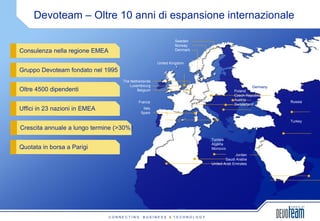 Devoteam è un leader europeo nella consulenza ICT, attivo in 23 paesi EMEA con oltre 4500 dipendenti e una crescita annuale superiore al 30%. Fondata nel 1995 e quotata in borsa a Parigi, offre servizi in strategia, innovazione, gestione dei rischi e architettura aziendale. Tra i suoi principali clienti ci sono enti governativi e aziende dei settori telecomunicazioni, finanza e media.