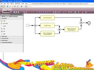 - The document discusses the history and capabilities of jBPM, an open source business process management system.