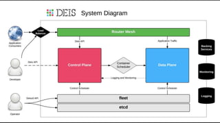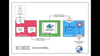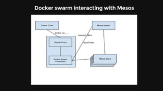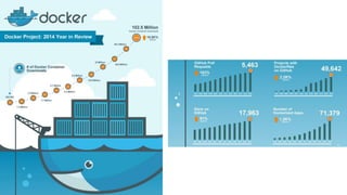 The document discusses the evolution and ecosystem of Docker, highlighting its significance in cloud computing, DevOps, and containerization. It covers Docker's architecture, features, and community engagement, as well as its integration with Microsoft Azure and other platforms. Additionally, it showcases various orchestration tools, including Docker Swarm, Kubernetes, Deis, and Cloud Foundry, illustrating the competitive landscape in the container orchestration space.