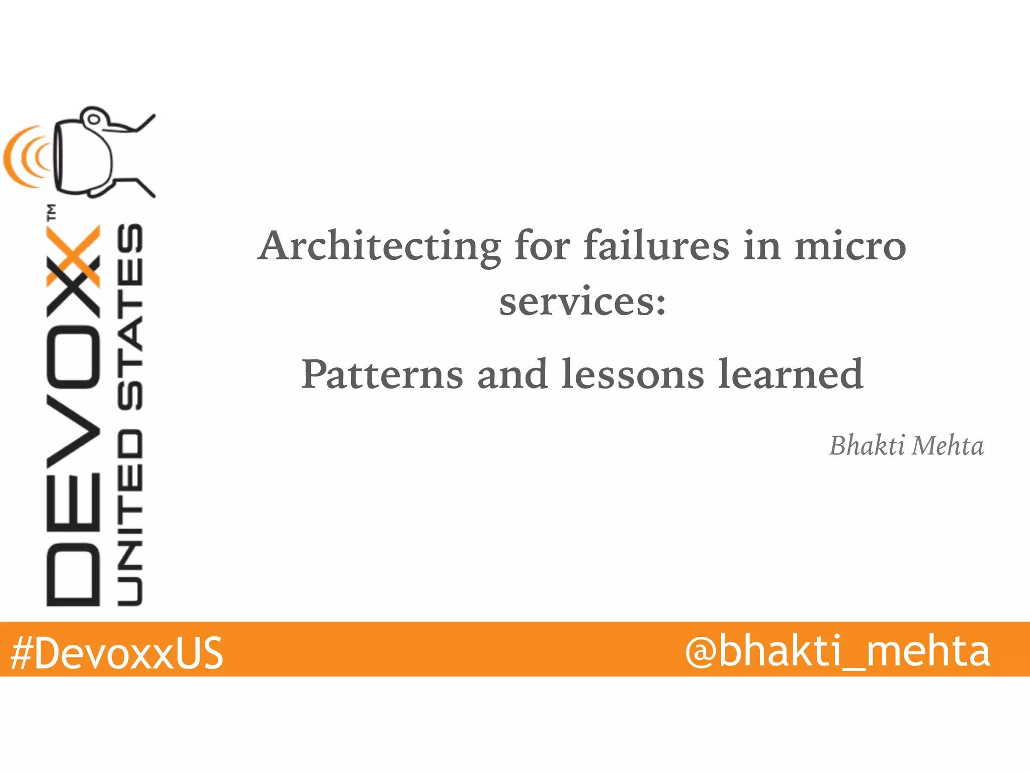 Bhakti Mehta presented on architecting microservices for failures and lessons learned. Some key points include: