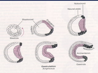 3. During gastrulation, the endodermal plate invaginates to form the archenteron while prospective mesoderm and notochord involute inward.