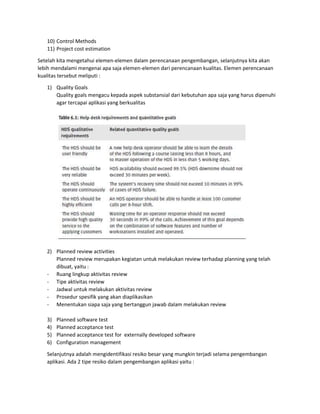 Perencanaan pengembangan dan kualitas perangkat lunak bertujuan untuk (1) menjadwalkan pengembangan, (2) merekrut tim yang kompeten, dan (3) mengimplementasikan arsitektur dan aktivitas penjaminan kualitas. Perencanaan ini melibatkan beberapa elemen seperti produk proyek, antarmuka proyek, metodologi pengembangan, dan manajemen resiko.