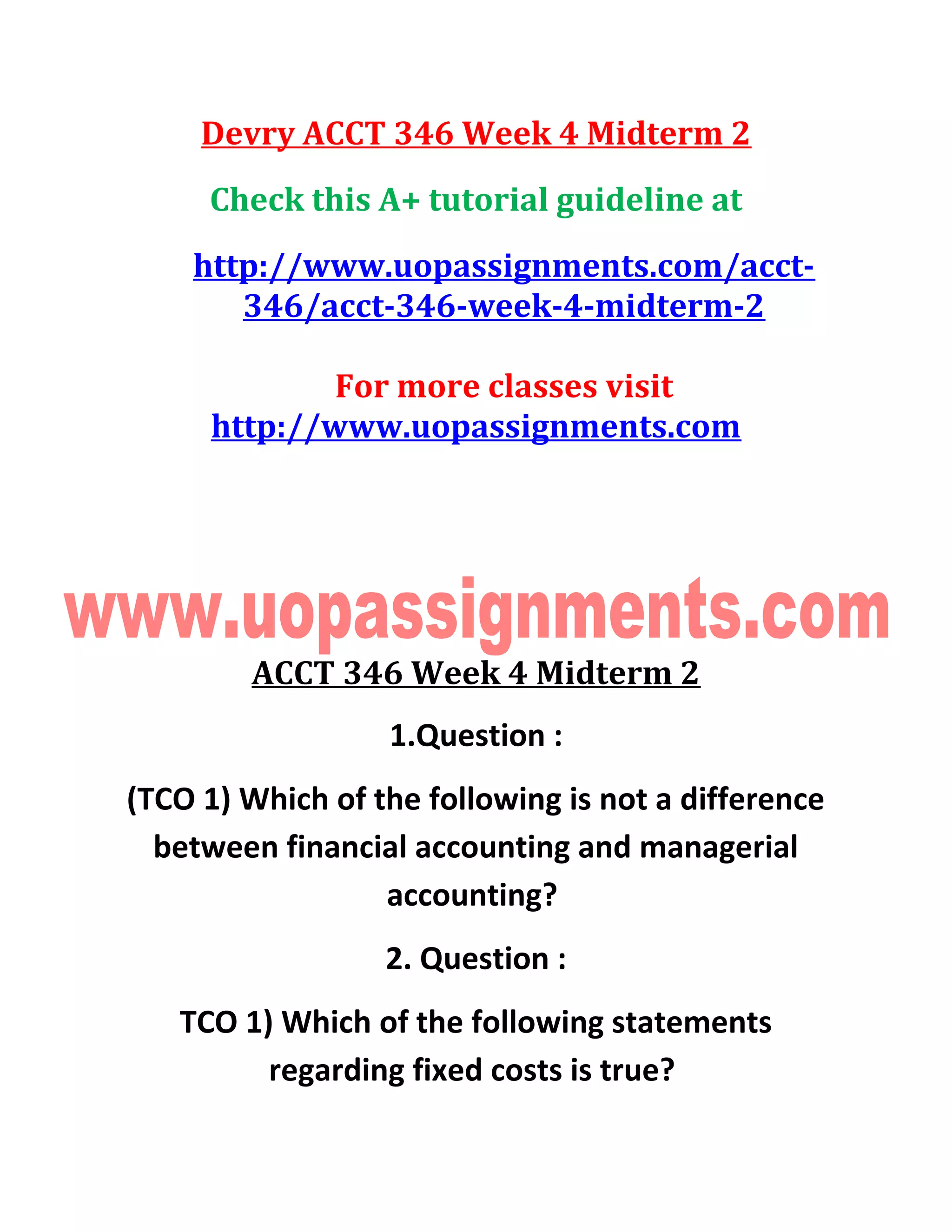 The document outlines various accounting questions related to managerial and financial accounting topics including cost accounting, fixed and variable costs, break-even analysis, and cost allocation. It presents multiple-choice questions (MCQs) that require understanding of concepts such as opportunity cost, equivalent units, and cost of goods manufactured. The questions are framed to test knowledge on a wide range of accounting principles and calculations.