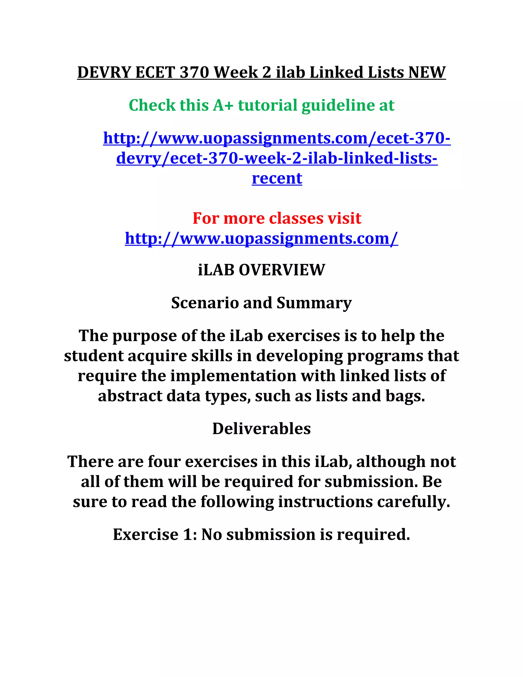 The document outlines the requirements for the ECET 370 Week 2 ILAB focused on linked lists, including an overview and essential exercises. It specifies that students must complete exercises 2, 3, and 4, submitting their .java files in designated subfolders after compressing the whole project folder. Key tasks include modifying a linked list to create a doubly linked list and developing specific methods for list manipulation.