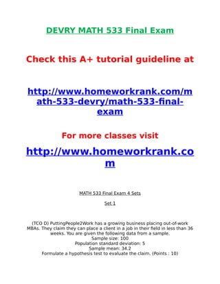 This document provides information and questions for the Devry Math 533 final exam, including:
