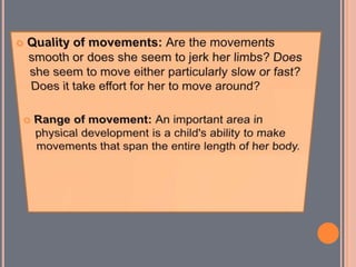 This document discusses principles of teaching and strategies related to physical development in children. It covers how physical growth provides abilities for children to explore their world, and defines motor development as the process where children acquire movement patterns and skills influenced by genetics and environment. Gross motor skills involve using the whole body, like rolling, crawling, walking and jumping. The document recommends children get 60 minutes of moderate to vigorous physical activity daily and limits on electronic screen time, and notes how physical activity can benefit health, social skills and self-esteem. Teachers are encouraged to understand each child's unique characteristics to help them reach their full potential.
