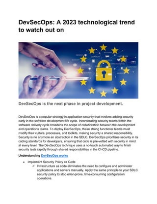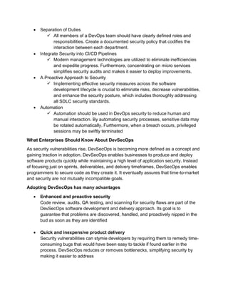 DevSecOps is a strategy that incorporates security practices into the software development lifecycle. It aims to produce secure software quickly by integrating security teams into development and operations. Adopting DevSecOps provides benefits like enhanced security, quicker product delivery, and an adaptable security process. Transitioning to DevSecOps requires aligning security, development, and operations as a shared responsibility from the beginning of the development cycle. Automating security testing helps detect vulnerabilities early to speed development while maintaining security.
