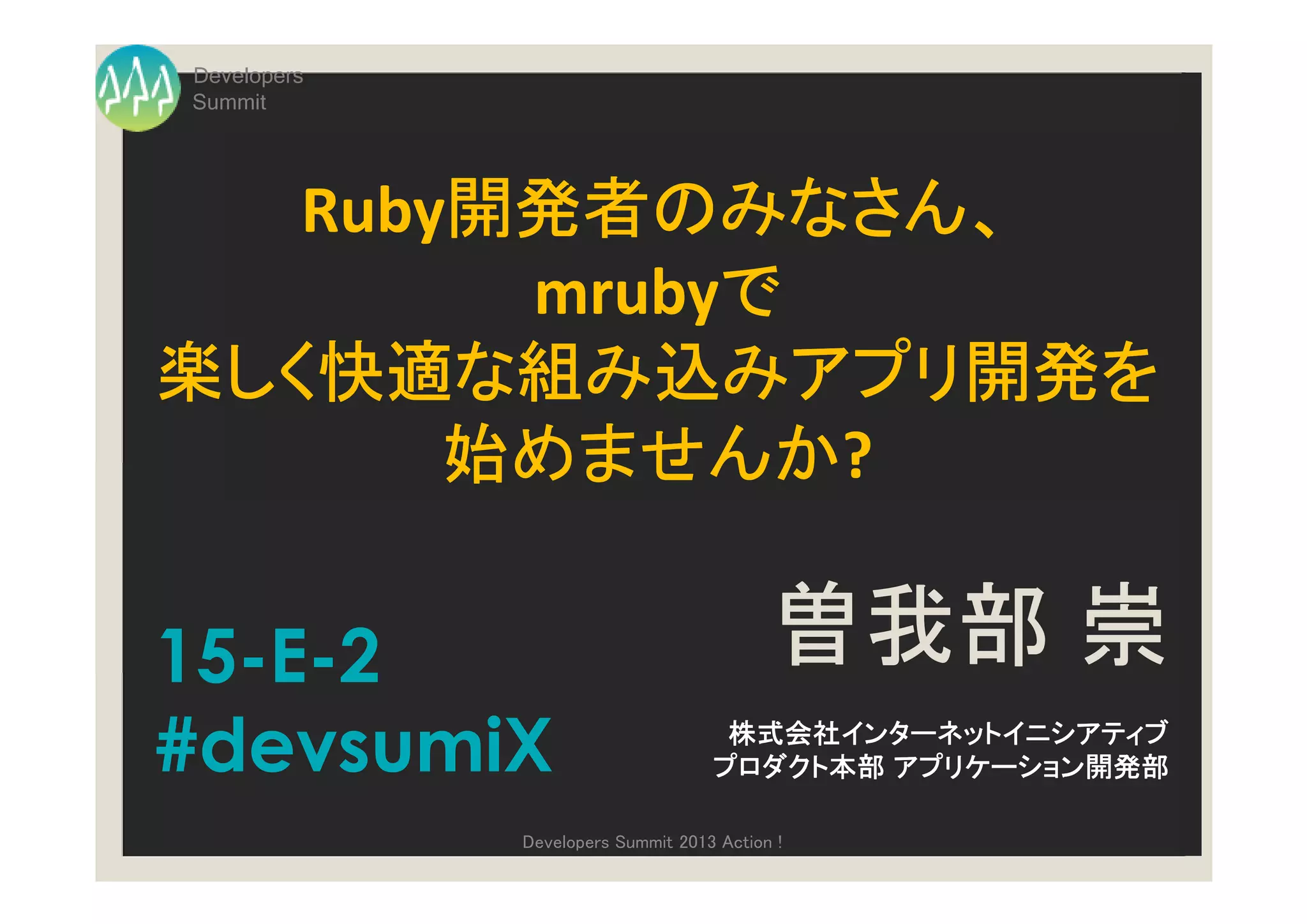 Rubyエンジニアのみなさんは、日々楽しくRubyプログラムの開発をされているこ とと思います。しかしながら、組み込み機器開発の世界では今でもC言語やアセ ンブラ言語などを用いた昔ながらの開発が主流であり、Rubyエンジニアで広く使 われているテスト駆動開発など最新の開発手法が普及しているとは言いにくい状 況です。このような中、2012年4月に軽量Ruby(mruby)がgithub上で公開されまし た。IIJでは、Rubyユーザでも楽しく快適に組み込みアプリを開発できる環境を 提供するために、独自開発のルータ「SEIL」上で動作するmrubyの実行環境を作 りました。本セッションでは、日々のちょっとした不便を改善するためにmruby を活用する方法についてご紹介します。また、mrubyはアプリに組み込むことで も便利に使うことができます。