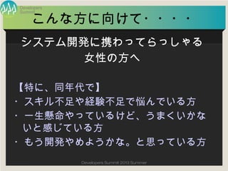 Summer こんな方に向けて・・・・ 【特に、同年代で】 ・スキル不足や経験不足で悩んでいる方 ・一生懸命やっているけど、うまくいかないと感 じている方 ・もう開発やめようかな。と思っている方 システム開発に携わってらっしゃる 女性の方へ