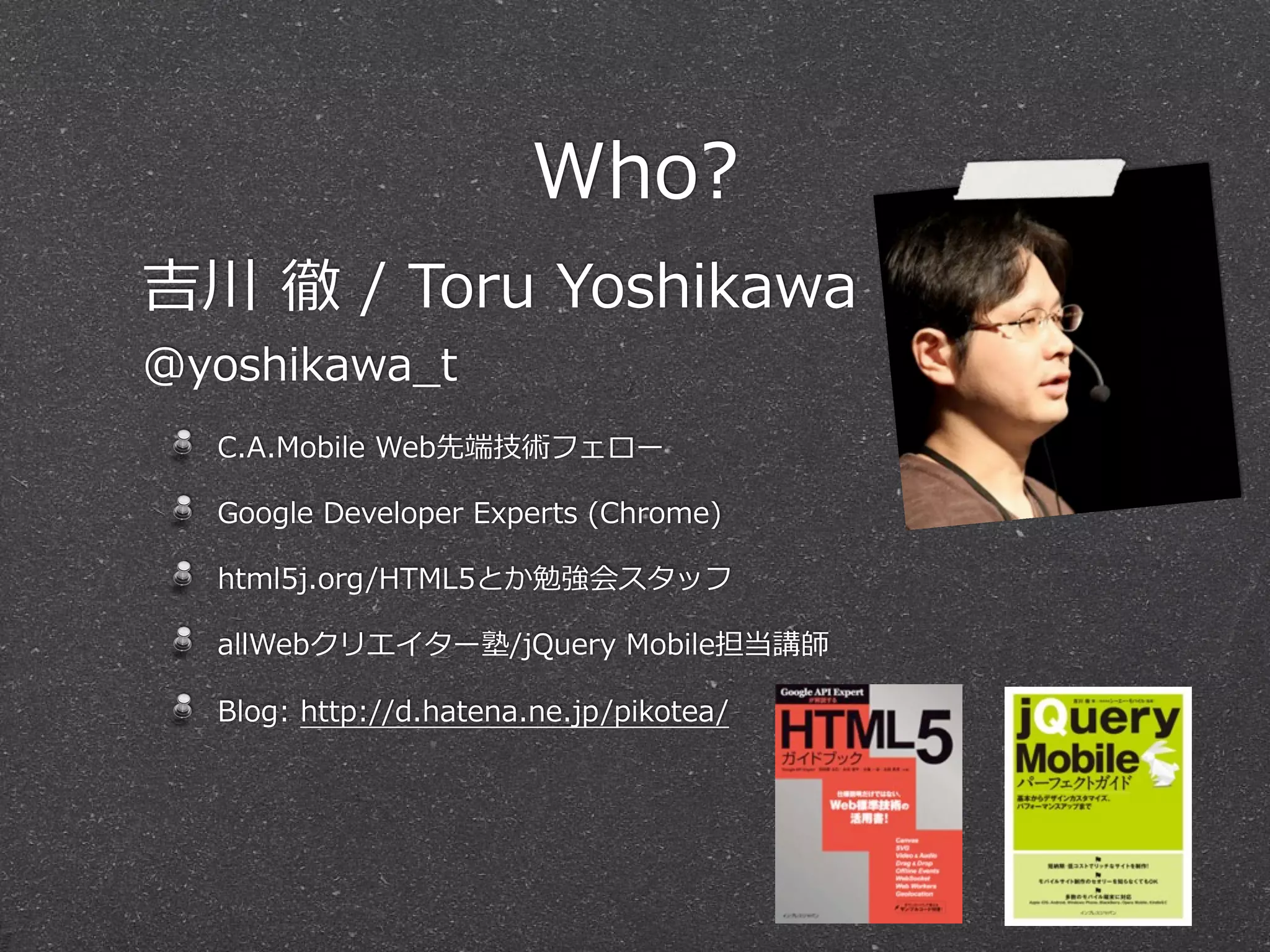 HTML5 Conference Miyazaki 2013のセッション資料です。