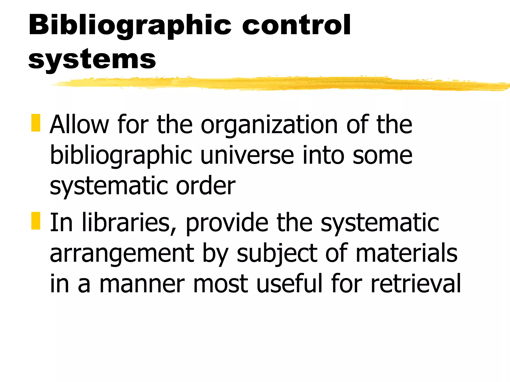 The document provides an overview of bibliographic control systems and classification schemes, focusing on the Dewey Decimal Classification system. It discusses the purpose of classification systems in organizing library collections and allowing users to retrieve related materials. It then describes the development of classification from early schemes to modern systems like Dewey Decimal and Library of Congress classifications. It explains key concepts in Dewey like number building, tables, and the relative index.