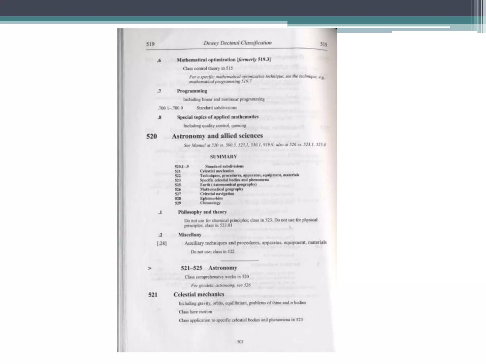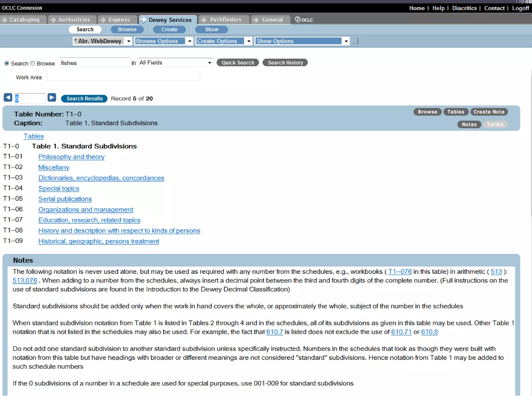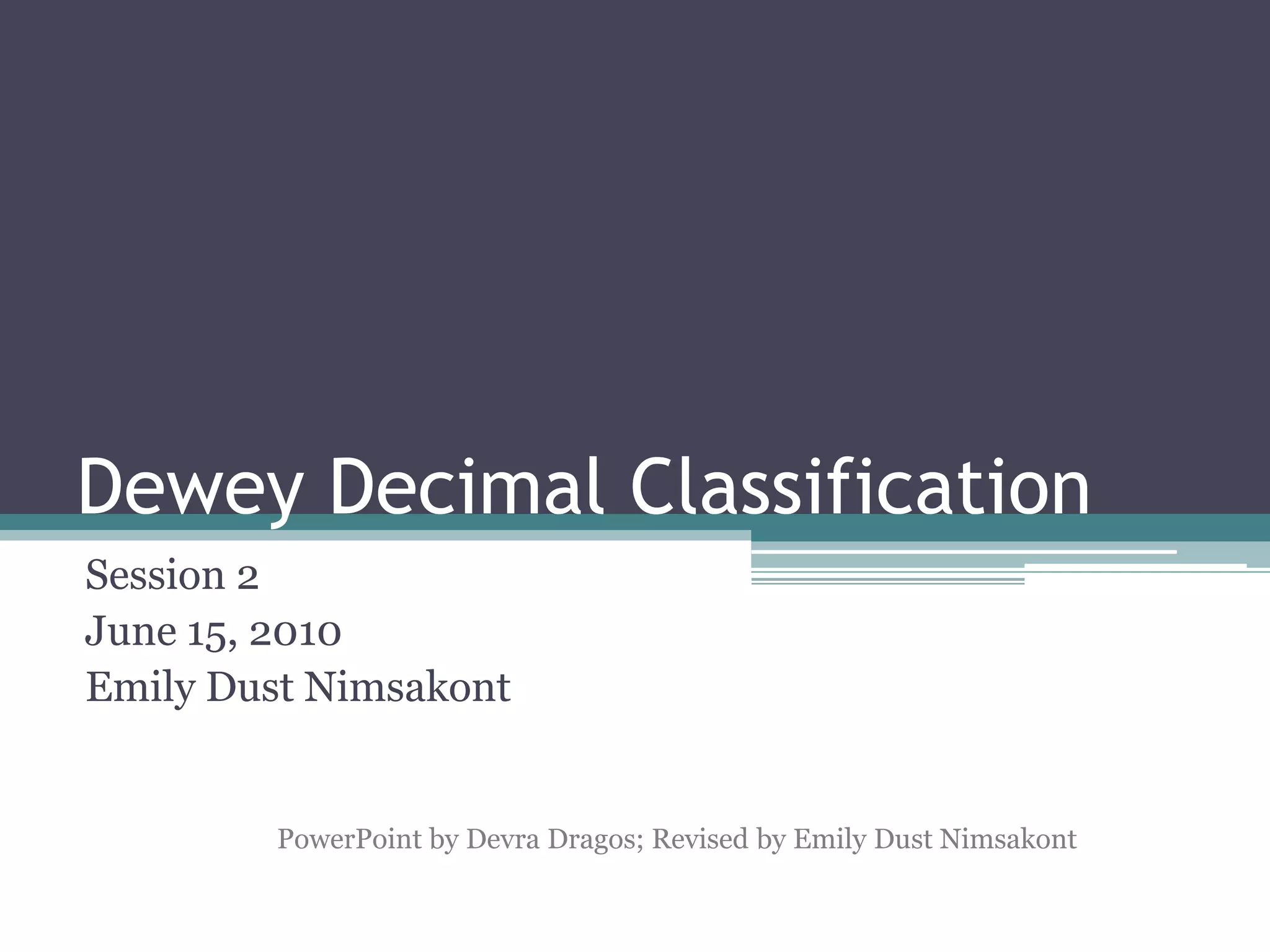 This document summarizes a training session on the Dewey Decimal Classification system. It discusses classifying works with multiple subjects or disciplines, using interdisciplinary numbers, and determining the main focus of a work. Standard subdivisions from Table 1 are explained for adding details like format, viewpoint, people, or location. Examples are provided for classifying books on various topics like fruit, media influence, and engineering statistics.