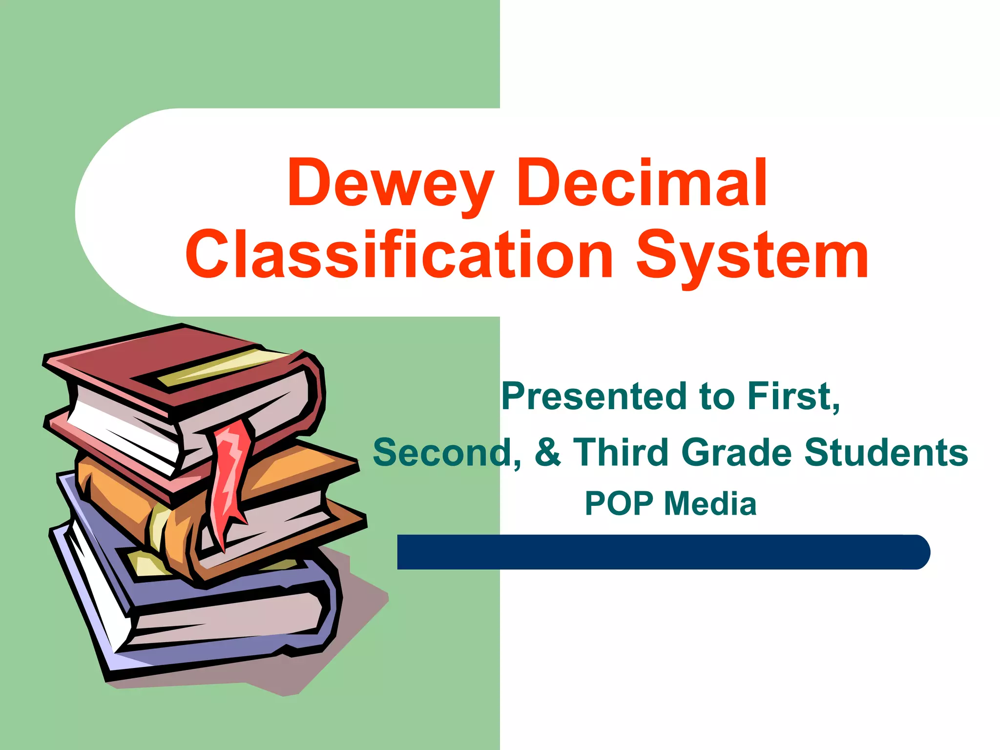 Melvil Dewey created the Dewey Decimal Classification System in 1873 when he was 21 years old. The system divides all knowledge into 10 main categories, with each category represented by 3 numbers. The categories are Generalities, Philosophy, Religion, Social Science, Language, Science & Math, Technology, Arts, Literature, and Geography & History. The Dewey Decimal Classification number can be found on the spine of each library book and helps to organize books on the shelves by subject.