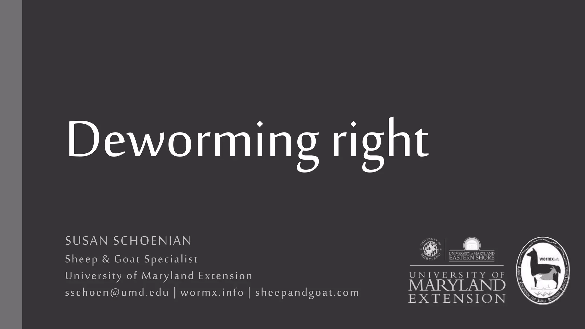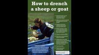 This document provides information on proper deworming practices for small ruminants. It discusses the classes of dewormers approved for use in sheep and goats, as well as extra-label dewormers. The goals of deworming and environmental considerations are covered. Targeted selective treatment is recommended over whole flock treatments to reduce dewormer resistance. Combination dewormer treatments and non-drug options like copper oxide wire particles are also discussed.