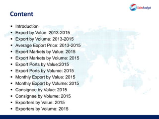 This document analyzes India's export market for dextromethorphan HBr from 2013-2015. It finds that the export value fell 11% annually, while volume fell 1% annually. The average price also declined 10% annually. In 2015, the top export markets by value were the United States (27%), China (21%), and Indonesia (6%). The top ports were Hyderabad Air Cargo (24%) and Hyderabad (17%). Exports peaked in December 2015. The leading consignees were Zhao Qing City Dingkang Pharmaceuticals (10%) and PT Global Chemindo Megatrading (4%). Divis Laboratories (63%) was the top exporter by value.