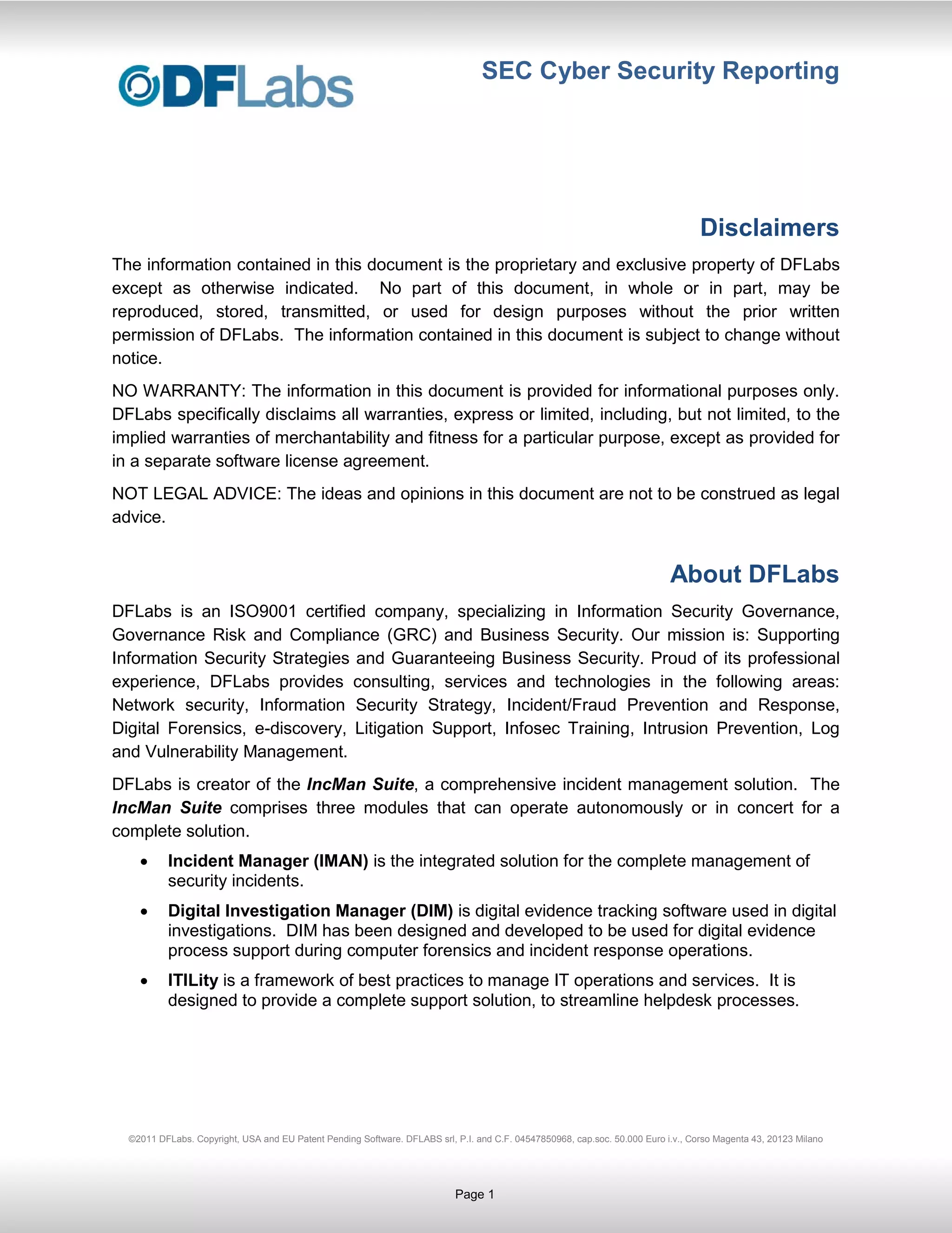 The document discusses the use of the dflabs incman suite for managing cyber security risks and incidents in compliance with SEC guidance. It highlights the importance of adequately disclosing cyber security risks to maintain investor confidence while navigating potential legal ramifications. Additionally, the incman suite offers tools for incident management, risk assessment, and legal documentation to support organizations in meeting compliance and disclosure obligations.