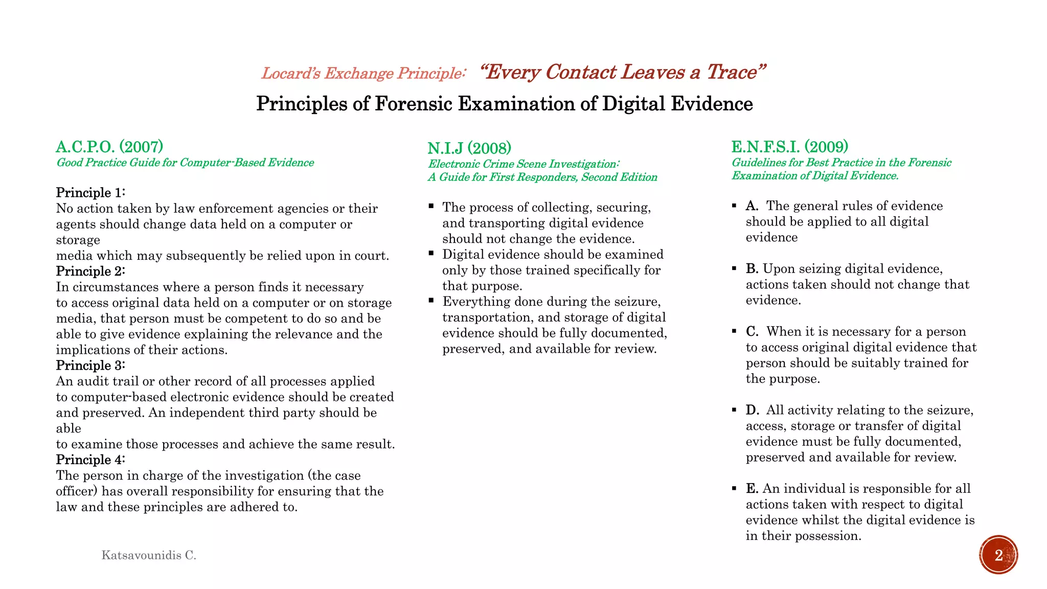 This document summarizes several models and frameworks for digital forensic examination developed between 2000-2015. It provides brief descriptions of key frameworks such as the ACPO principles of 2007, NIJ guidelines of 2008, ENFSI guidelines of 2009 and several process models including the 3A model, IDIP model, InteDFPM model and Palantir framework for collaborative incident response. The document is intended to provide an overview of the evolution of digital forensic examination processes and standards over this 15 year period.