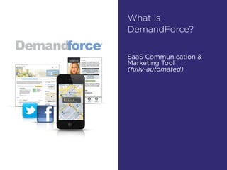 DemandForce is a communication and marketing tool that allows Keith Clinic to send automated appointment reminders, rescheduling options, and other messages to patients via text or email. It integrates with the clinic's patient management system to access appointment information. DemandForce keeps records of all patient interactions and aims to improve efficiency of communication with patients at scale. However, some criticisms of it include that the visual design is not very appealing and it does not allow direct scheduling through the platform.