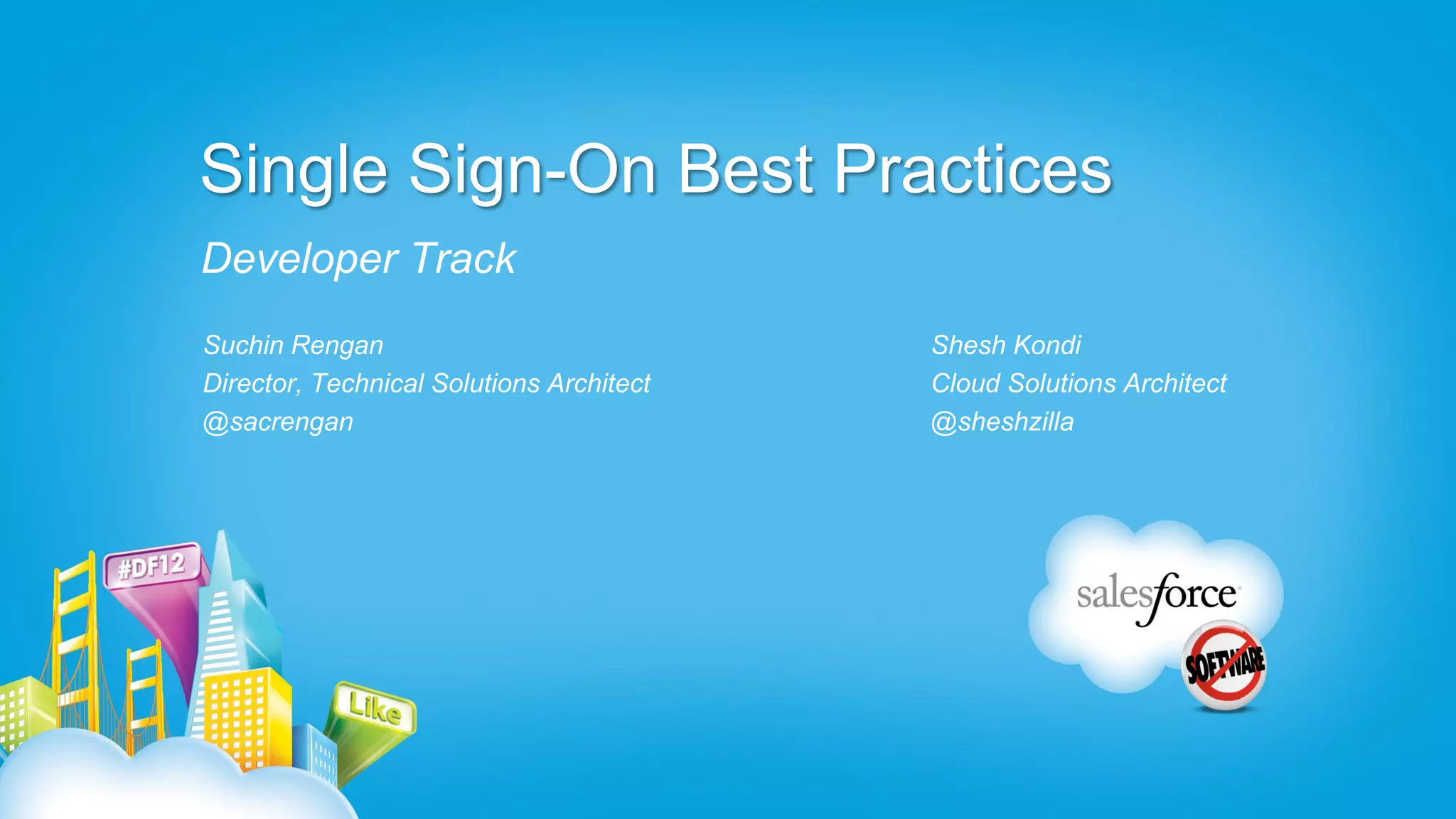 The document discusses single sign-on best practices. It recommends developing troubleshooting practices for SSO failures, such as having a process to gather information and check login errors. It also suggests preventing failures by ensuring high availability of IDP servers, being proactive about certificate expirations, and testing implementations. Reliable and scalable SSO can be achieved using federation IDs instead of Salesforce usernames and disabling direct login to Salesforce when SSO is enabled.