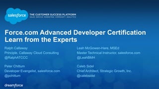 This document outlines the Salesforce Certified Force.com Advanced Developer program, detailing the exam structure, prerequisites, and maintenance requirements. It includes information on the programming assignment, the scoring methodology for evaluations, and the importance of adhering to the certification program agreement. The document also emphasizes available resources for preparation and the significance of certification in the developer community.