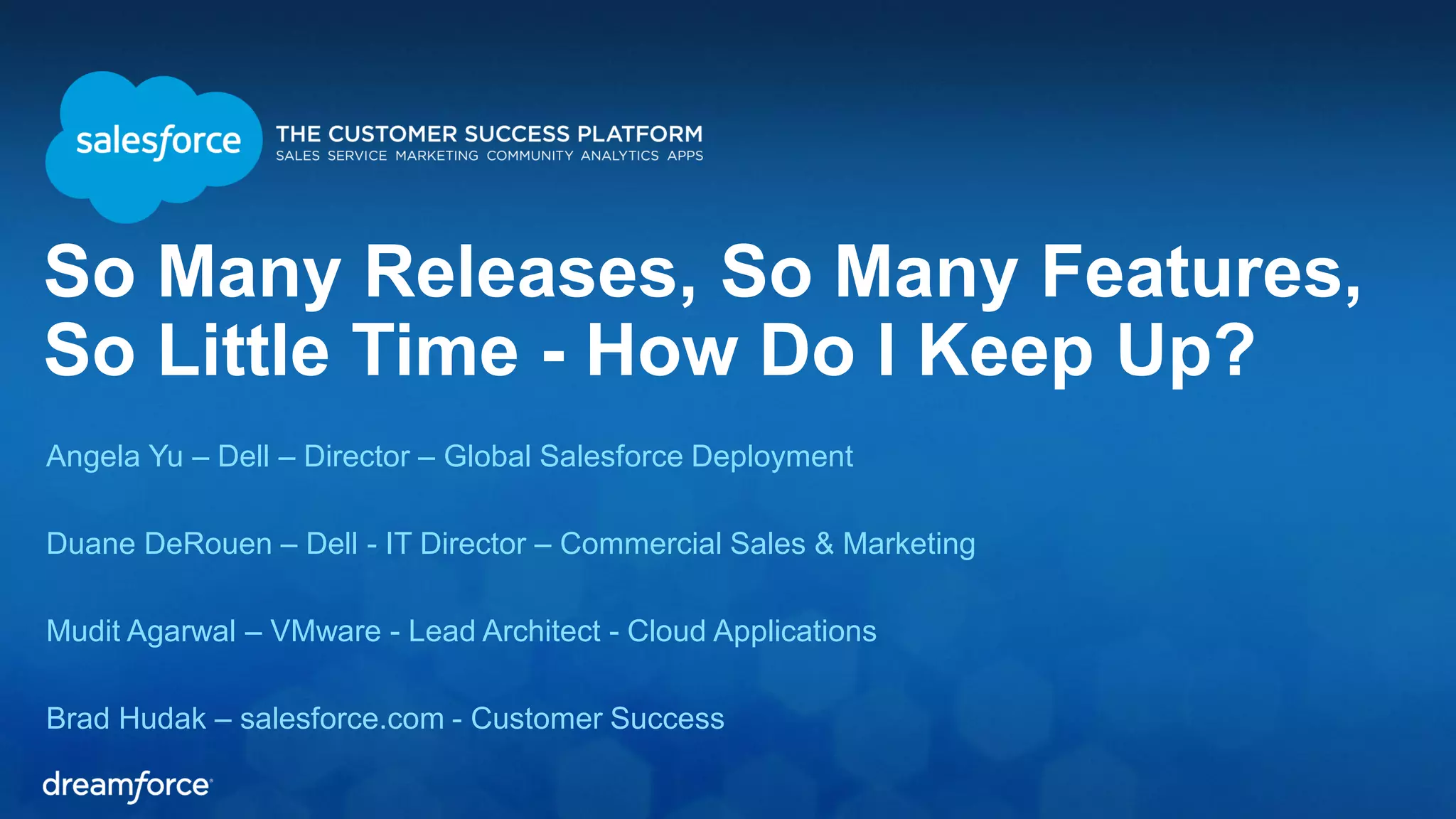 Our team introduced resources and programs to help customers drive adoption and ROI from Salesforce. The presentation discussed personalized success plans, success managers, success architects, and strategic projects from their certified Salesforce implementation team. It also covered training, certification, and customized learning paths to help customers get the most from their investment. Speakers from Dell and VMware then shared their journeys transforming with Salesforce and processes for evaluating new features in releases.