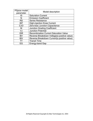 The document outlines the device modeling report for the DF30PC3M Schottky rectifier manufactured by Shindengen Bee Technologies Inc., including its PSPICE model parameters and simulation results. It presents the forward current characteristics and junction capacitance characteristics with comparison graphs that evaluate the circuit simulation results against measurements, indicating errors in percentage. The copyright for the document is retained by Bee Technologies Inc. for the year 2004.