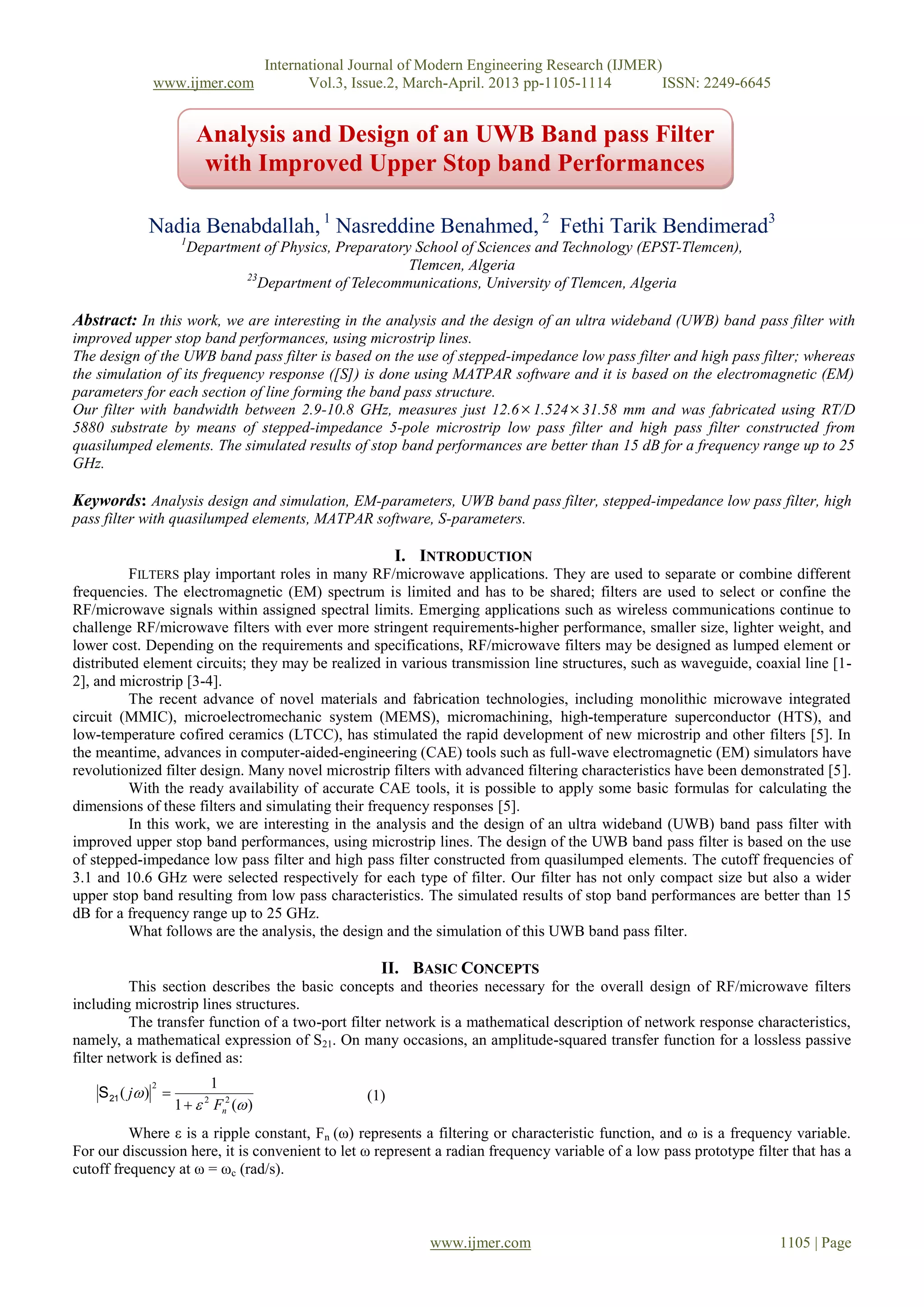 The document summarizes the analysis, design, and simulation of an ultra-wideband (UWB) bandpass filter with improved upper stopband performance using microstrip lines. Key points: