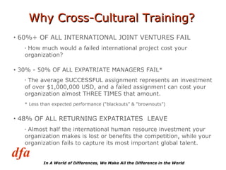 - Cross-cultural training is important because 60% of international joint ventures fail and 30-50% of expatriate managers fail or underperform in their assignments. The average successful international assignment costs over $1 million USD.