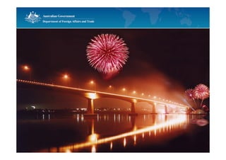 The document discusses private sector development in Australia's aid program. It notes that private capital flows, remittances, and trade contribute far more to developing economies than official development assistance. Australia's aid program aims to promote private sector growth in developing countries by engaging businesses in the design and delivery of aid investments, innovative financing approaches, public-private partnerships, and improving regulations. The program also supports global economic growth and facilitates trade, investment, and partnerships between Australian and developing country businesses.