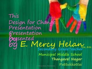 This document is a presentation by E. Mercy Helan, a secondary grade teacher from the Municipal Middle School in Pattukkottai, about a project to build a safety wall. The project volunteers are repairing a damaged compound wall around the school campus using bricks, string, plants and flex to prevent unauthorized people and animals from entering. The current wall is at risk of falling down, which could endanger students who play nearby.