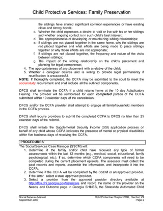 This document outlines requirements and procedures for Child Protective Services regarding family preservation and conducting Comprehensive Child and Family Assessments (CCFAs). It states that DFCS must initiate a CCFA within 1 day of a preliminary protective hearing and collaborate with Amerigroup to ensure children receive medical exams. It provides details on the components that must be included in CCFAs and the process that DFCS and providers must follow to complete them.