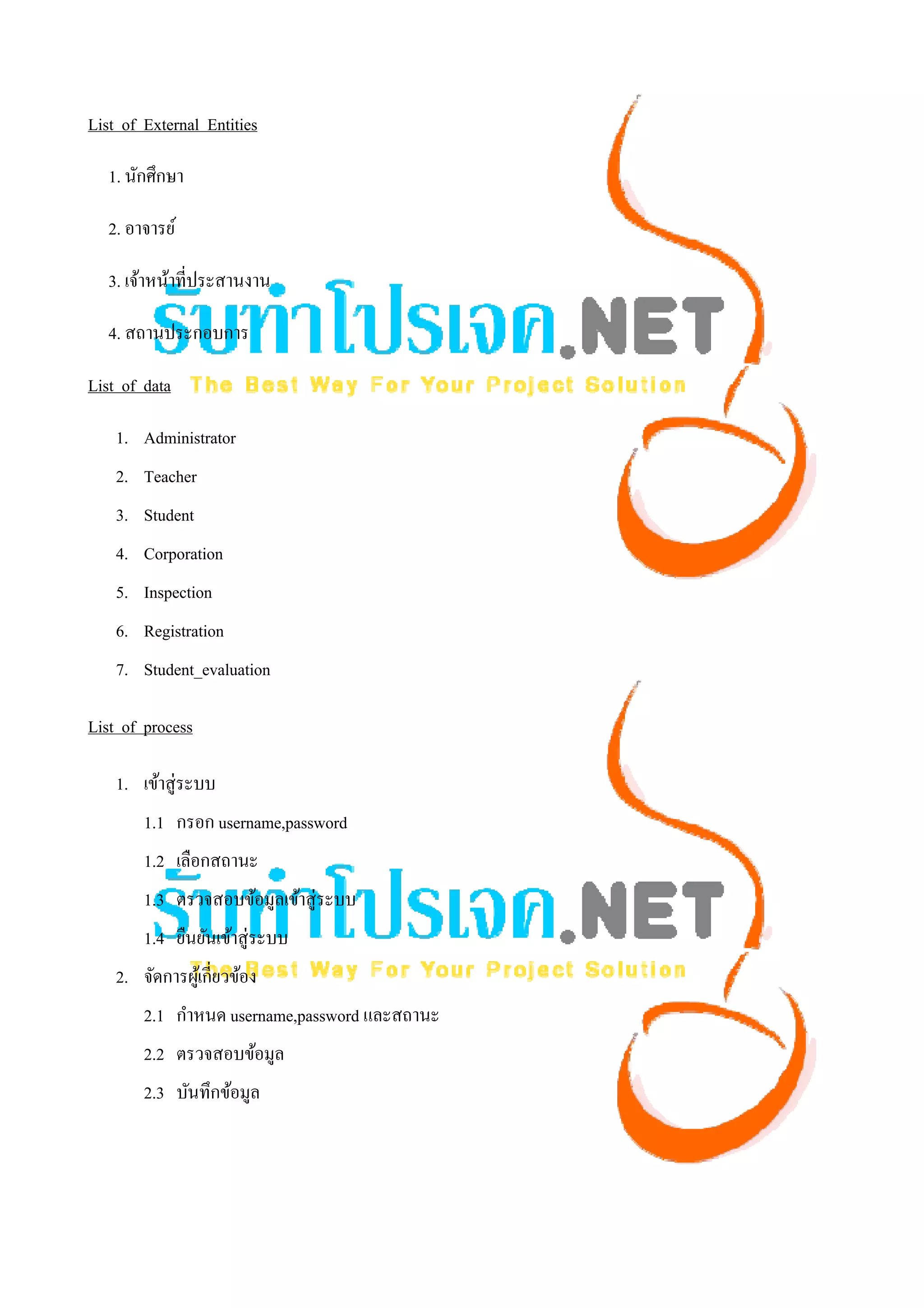 Entities 1. นักศึกษา 2. อาจารย์ 3. เจ้าหน้าที่ประสานงาน 4. สถานประกอบการ List of data 1. Administrator 2. Teacher 3. Student 4. Corporation 5. Inspection 6. Registration 7. Student_evaluation List of process 1. เข้าสู่ระบบ 1.1 กรอก username,password 1.2 เลือกสถานะ 1.3 ตรวจสอบข้อมูลเข้าสู่ระบบ 1.4 ยืนยันเข้าสู่ ระบบ 2. จัดการผูเ้ กี่ยวข้อง 2.1 กําหนด username,password และสถานะ 2.2 ตรวจสอบข้อมูล 2.3 บันทึกข้อมูล